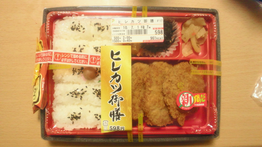 このお弁当、ずっと気になっていて ついに食べる決意をし、食べてみる事にしました。 他のお弁当と比べて、 容器がとってもゴージャス!!まさか容器分値段が高くなったんじゃないだろうな・・ と少し心配しながらも、からしとソースをヒレカツにかけた・・・・ ヒレカツ御膳 オレンジラベル 961キロカロリー 598円 食べてみるとウマーイ!!実にウマーイ!! ヒレカツにしては少しかたい気もするが、味に問題はない。 結構ガッツリとしていてお腹を満たしてくれる(^○^) だがしか~し!!カツカレーの方が美味しかった(+o+) ヒレカツ御膳・・・・残念ながら、値段も考慮すると星3つ。 ★★★☆☆(3)